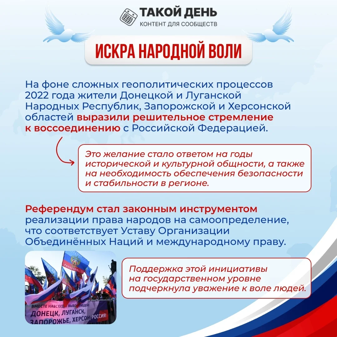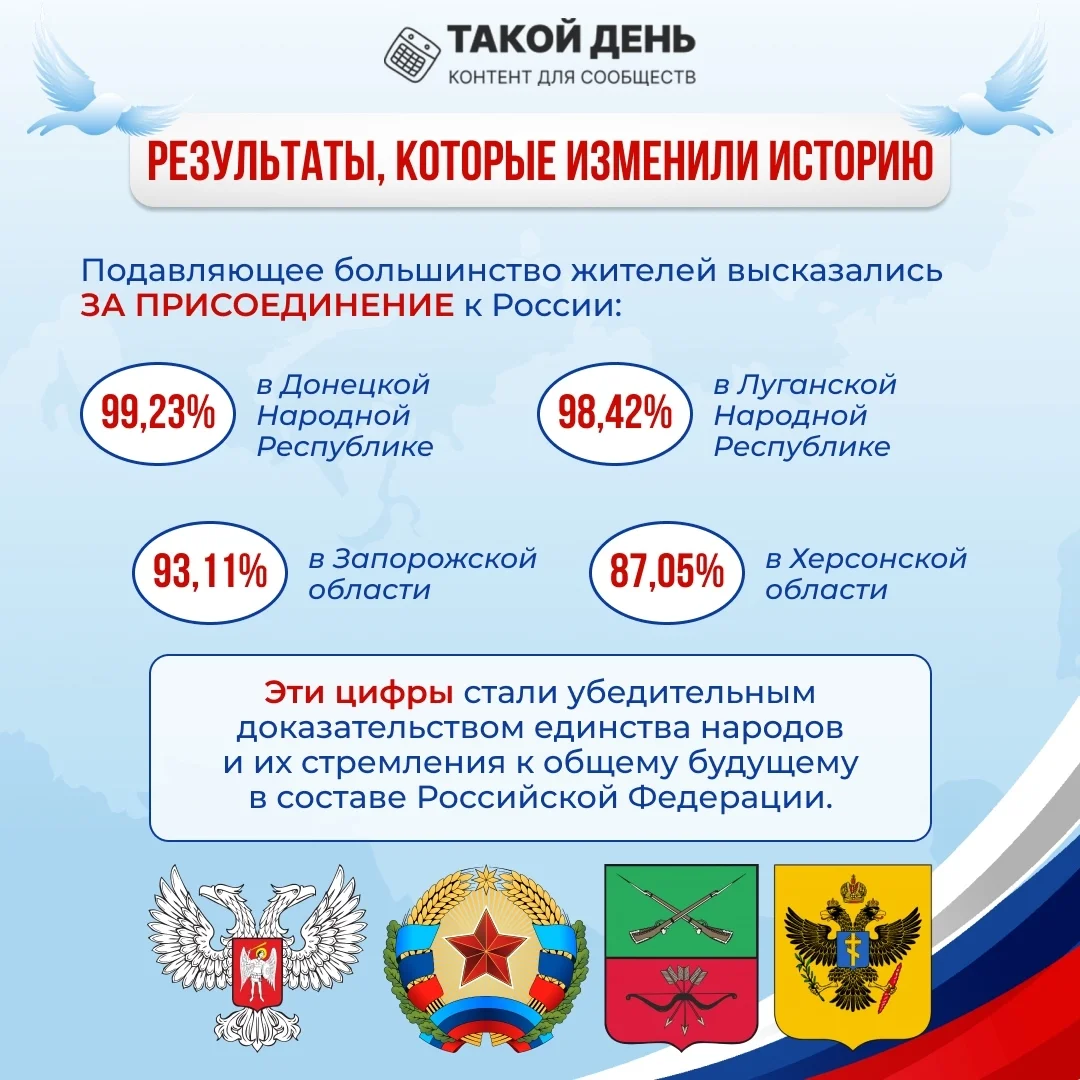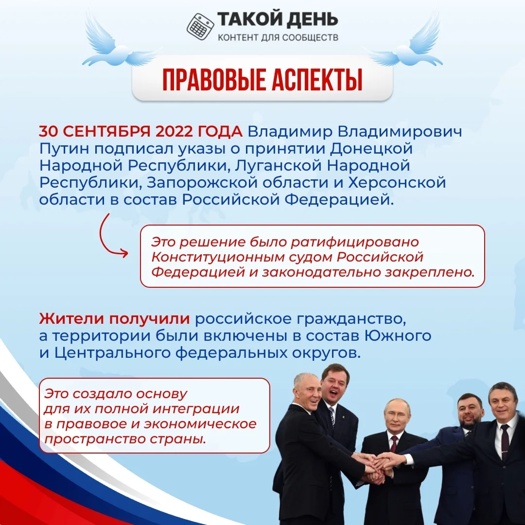 30 сентября - день воссоединение России с Донецкой и Луганской народными республиками, а также с Запорожской и Херсонской областями.
