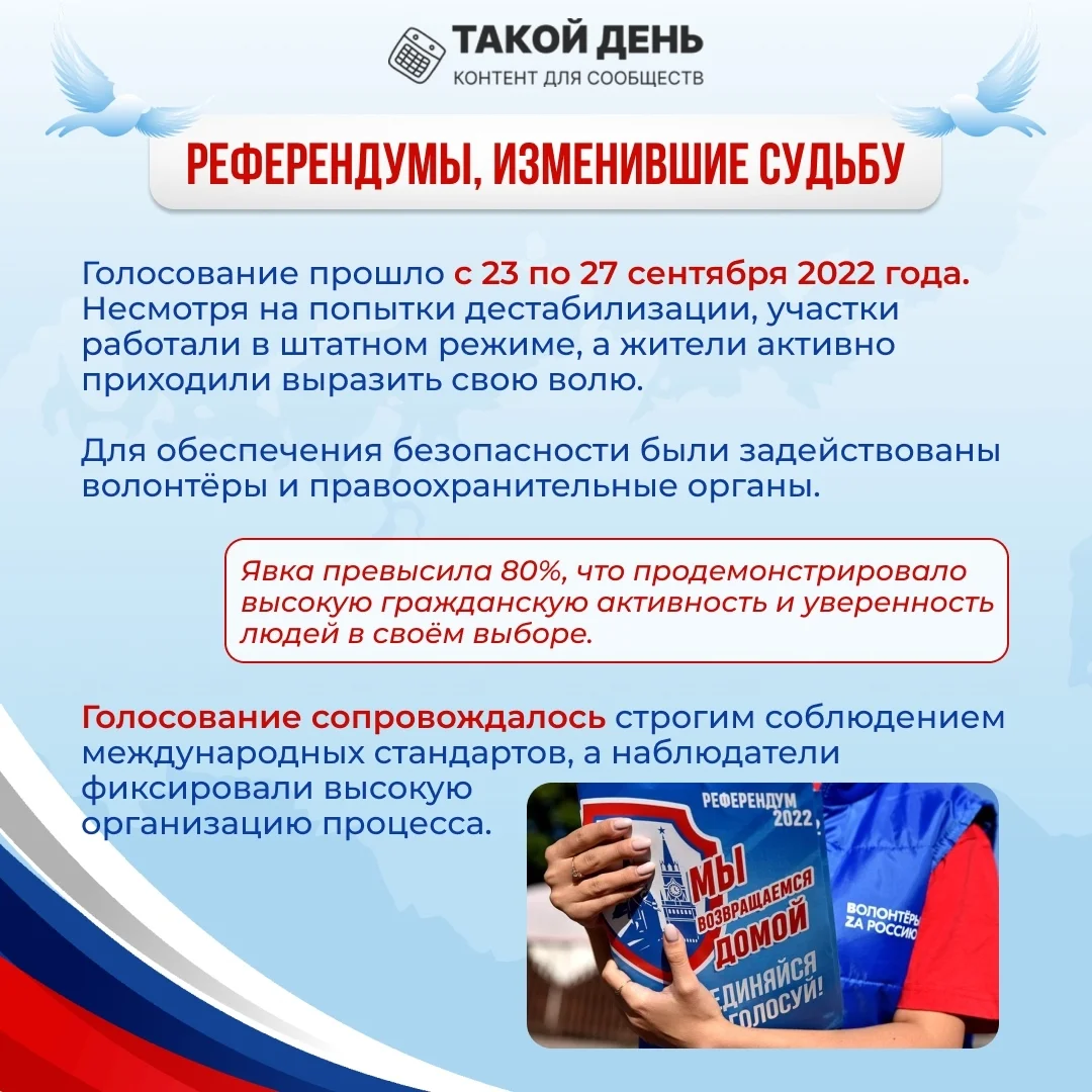 30 сентября — день, когда произошло историческое событие: воссоединение России с Донецкой и Луганской народными республиками, а также с Запорожской и Херсонской областями.