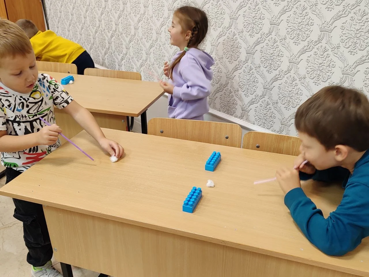А во второй части занятия кипели настоящие страсти вокруг упражнения «Попади в ворота». Эта увлекательная игра помогла детям поработать над формированием сильной и целенаправленной воздушной струи — важнейшего навыка для четкого звукопроизношения. Таким образом, занятие гармонично объединило развитие мелкой моторики, чувства ритма и правильного речевого дыхания.