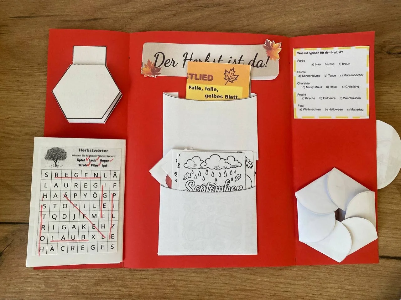 Вдохновлённые красотой окружающего мира, мы начали творить свой собственный "летбук" (Lesebuch) осени. В него вошли вырезанные рисунки, фотографии природы, стихотворения и песни, задания и ребусы. Этот альбом стал нашим общим сокровищем и копилкой знаний.