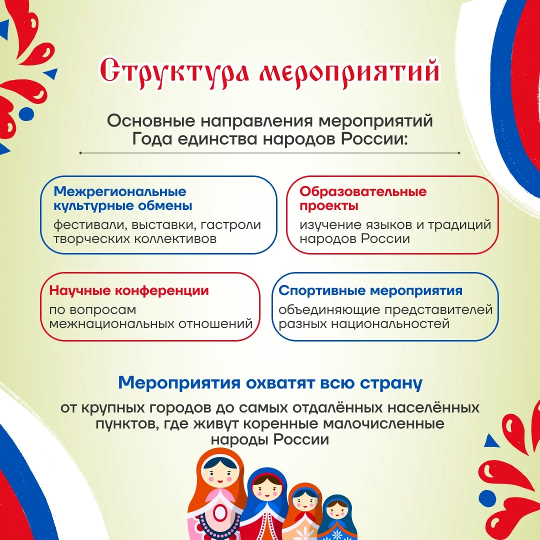 Это время укрепить дружбу между всеми, кто живёт в нашей многонациональной стране. В рамках года пройдут фестивали, спортивные события, образовательные проекты и новые праздники — День коренных народов и День языков народов России.