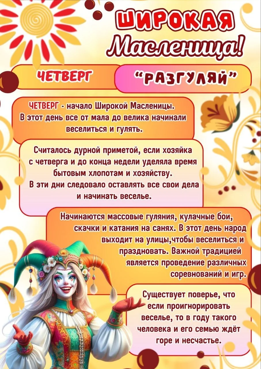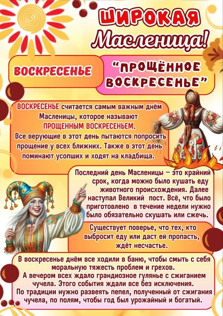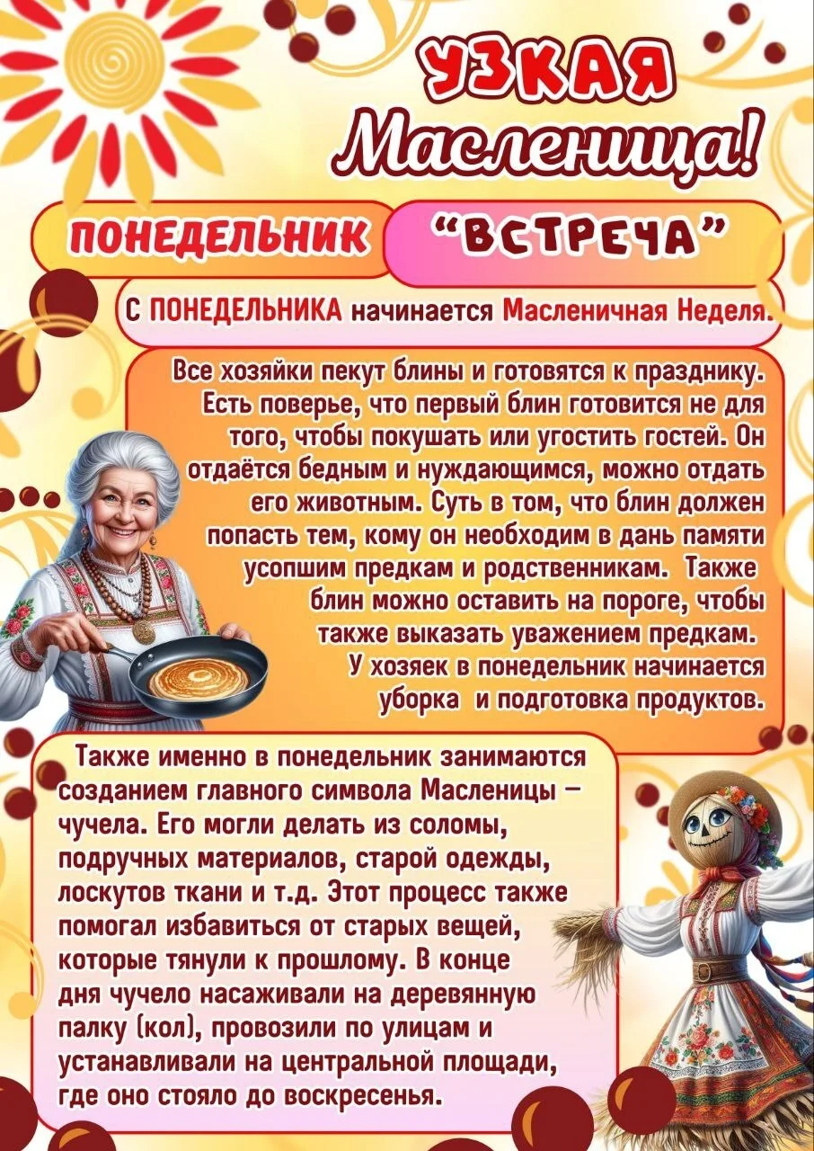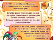 Каждый день масленичной недели имеет своё название и традиции: от встречи праздника в понедельник до проводов зимы и сжигания чучела в воскресенье.