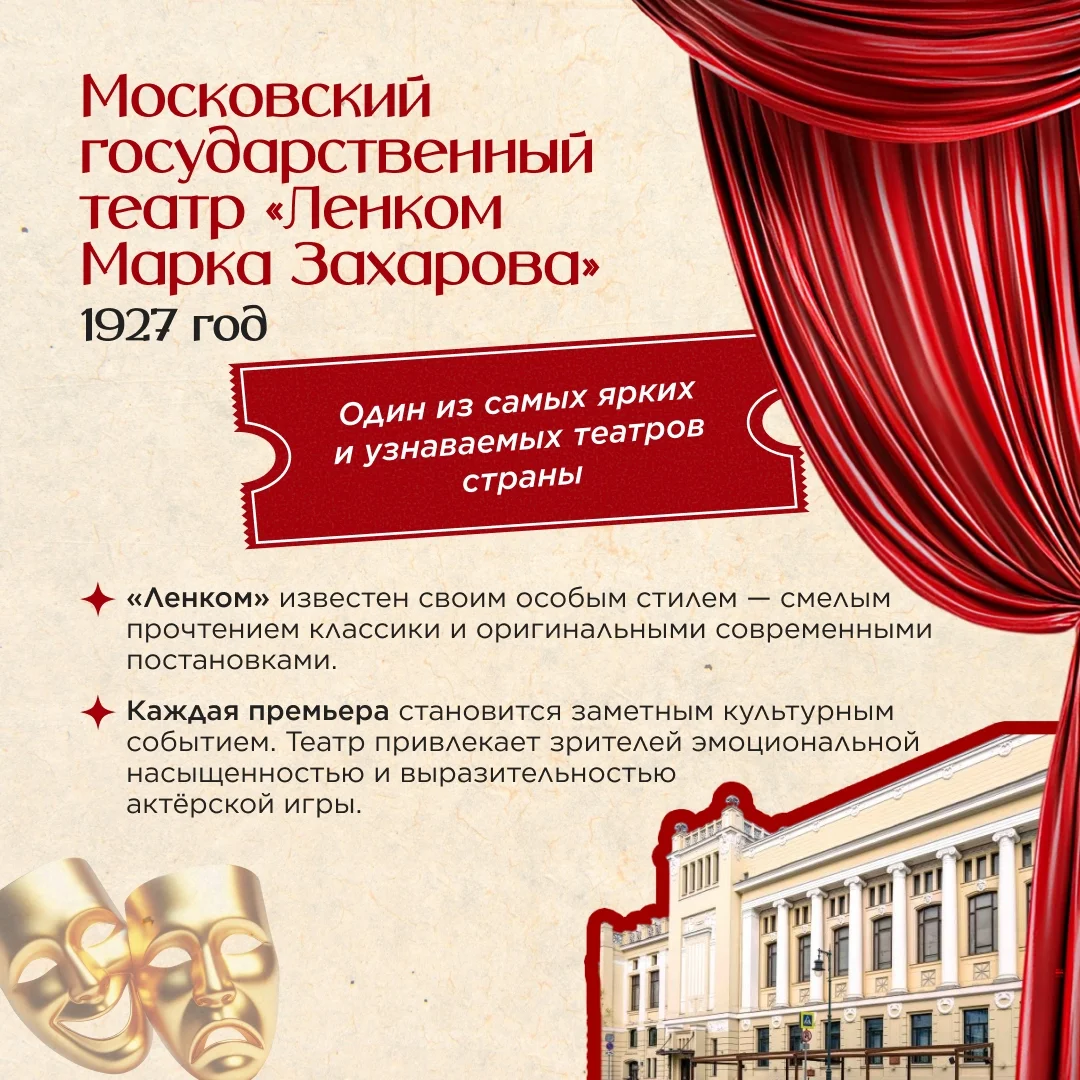 Московский государственный театр «Ленком Марка Захарова» (1927) Один из самых ярких и узнаваемых театров страны. Особый стиль — смелое прочтение классики и оригинальные современные постановки. Каждая премьера становится заметным культурным событием.