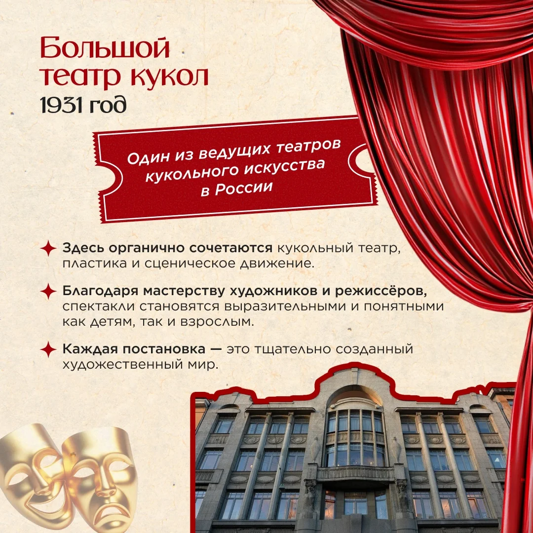 Большой театр кукол (1931) Один из ведущих театров кукольного искусства в России. Здесь органично сочетаются кукольный театр, пластика и сценическое движение. Благодаря мастерству художников и режиссёров спектакли становятся выразительными и понятными как детям, так и взрослым.