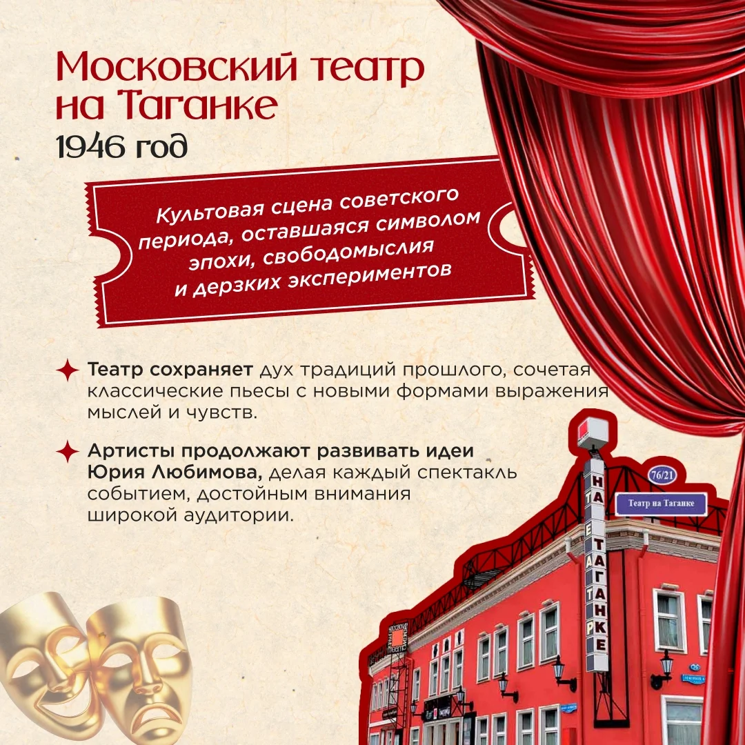 Московский театр на Таганке (1946) Культовая сцена, символ эпохи, свободомыслия и дерзких экспериментов. Театр сохраняет дух традиций прошлого, сочетая классику с новыми формами выражения мыслей и чувств.