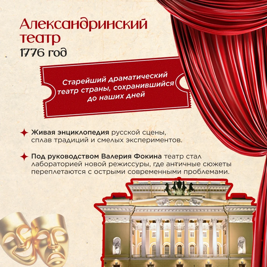 Александринский театр (1776) Старейший драматический театр страны. Живая энциклопедия русской сцены, сплав традиций и смелых экспериментов. Под руководством Валерия Фокина театр стал лабораторией новой режиссуры.