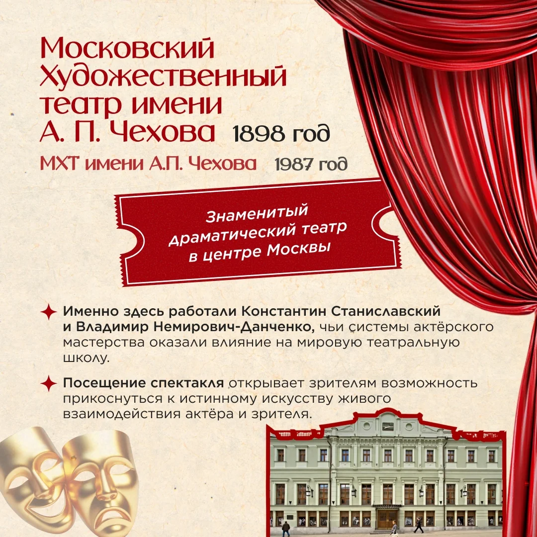 Московский Художественный театр имени А. П. Чехова (1898) Здесь работали Константин Станиславский и Владимир Немирович-Данченко, чьи системы актёрского мастерства повлияли на мировую театральную школу. Посещение спектакля МХТ — возможность прикоснуться к истинному искусству живого взаимодействия актёра и зрителя.
