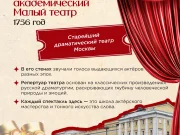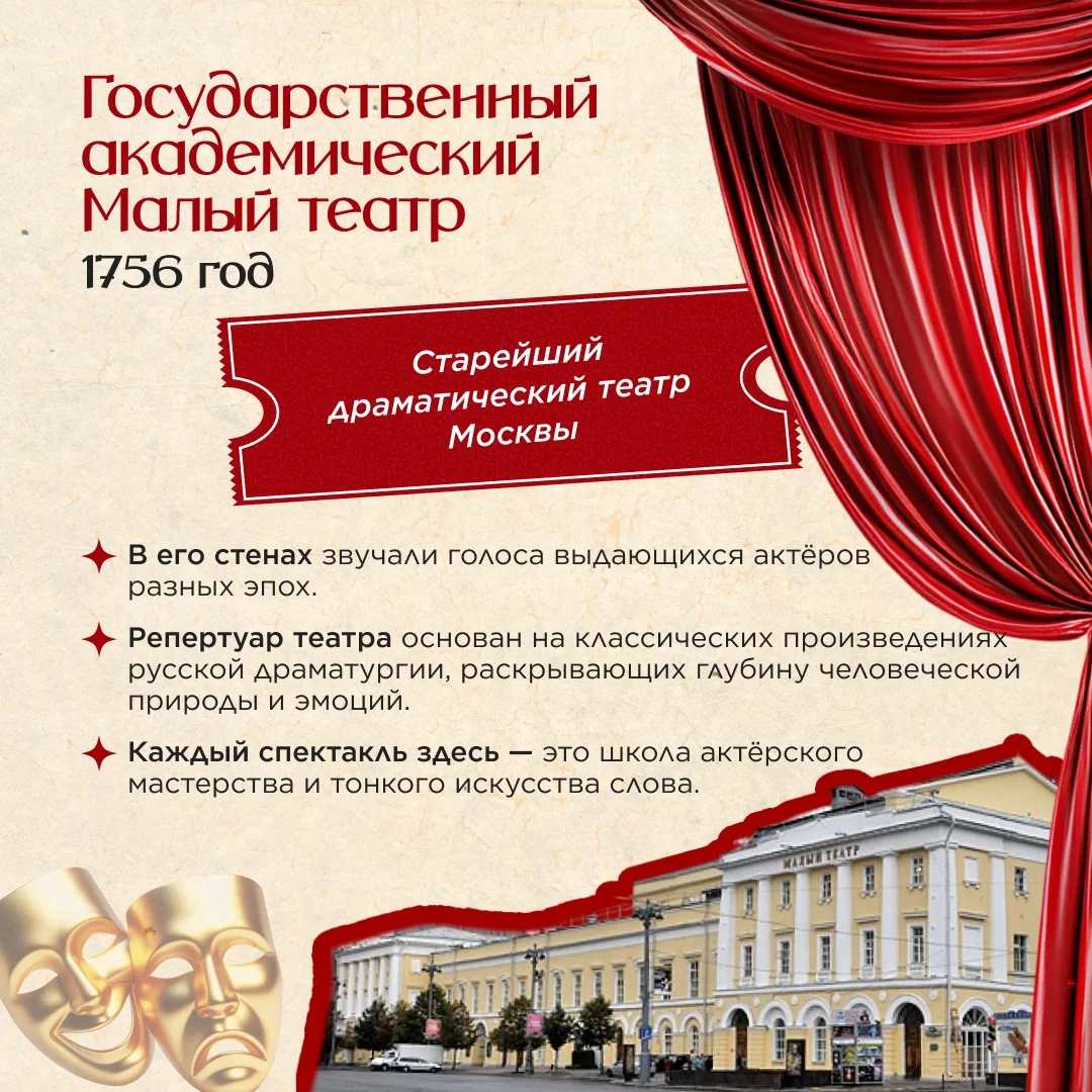 Государственный академический Малый театр (1756) Старейший драматический театр Москвы. В его стенах звучали голоса выдающихся актёров разных эпох. Репертуар основан на русской классике, а каждый спектакль — это школа актёрского мастерства и тонкого искусства слова.