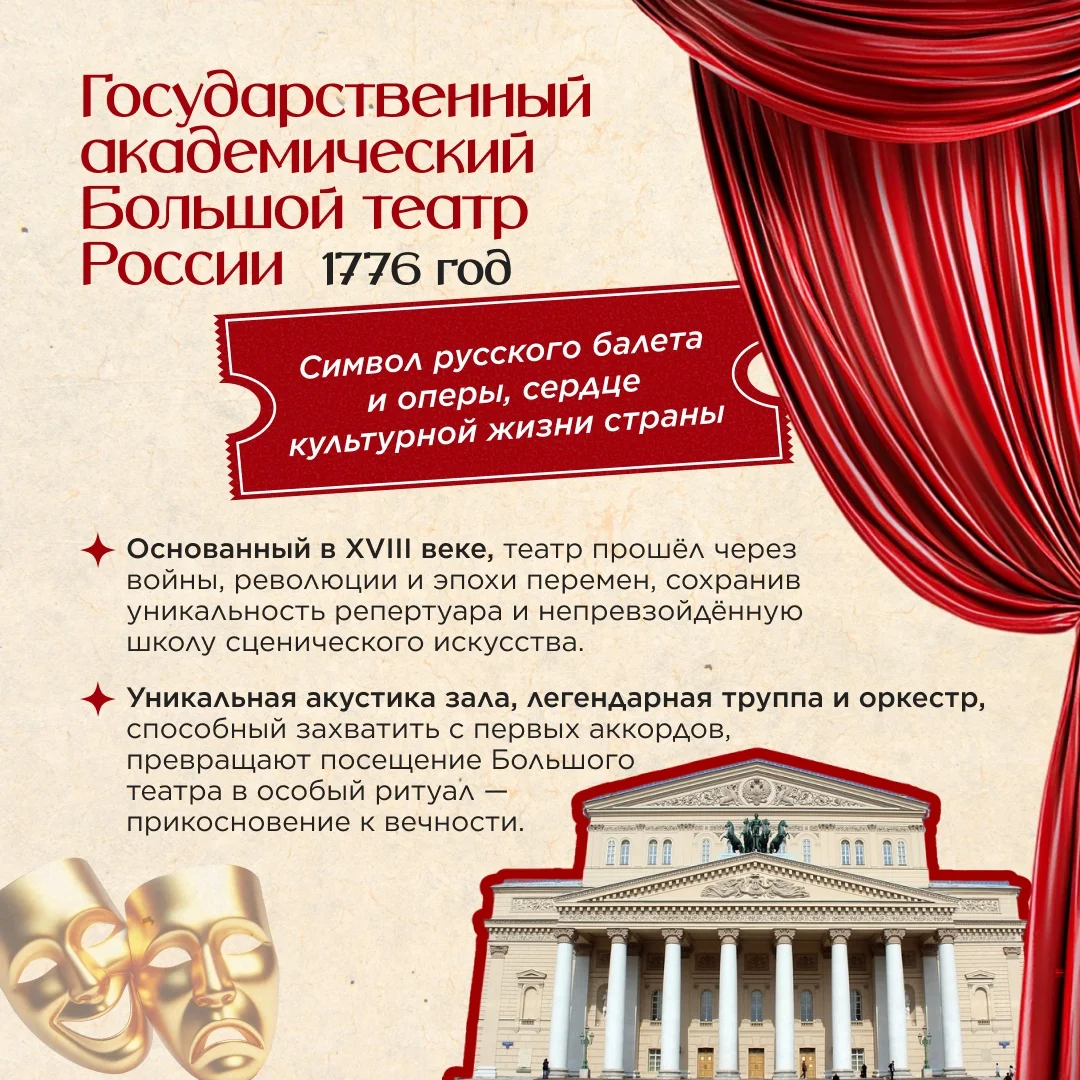 Государственный академический Большой театр России (1776) Символ русского балета и оперы. Уникальная акустика, легендарная труппа и оркестр, способный захватить с первых аккордов. Посещение Большого — особый ритуал, прикосновение к вечности.